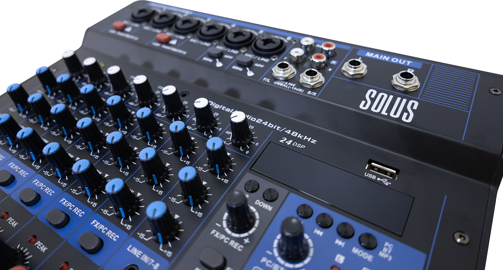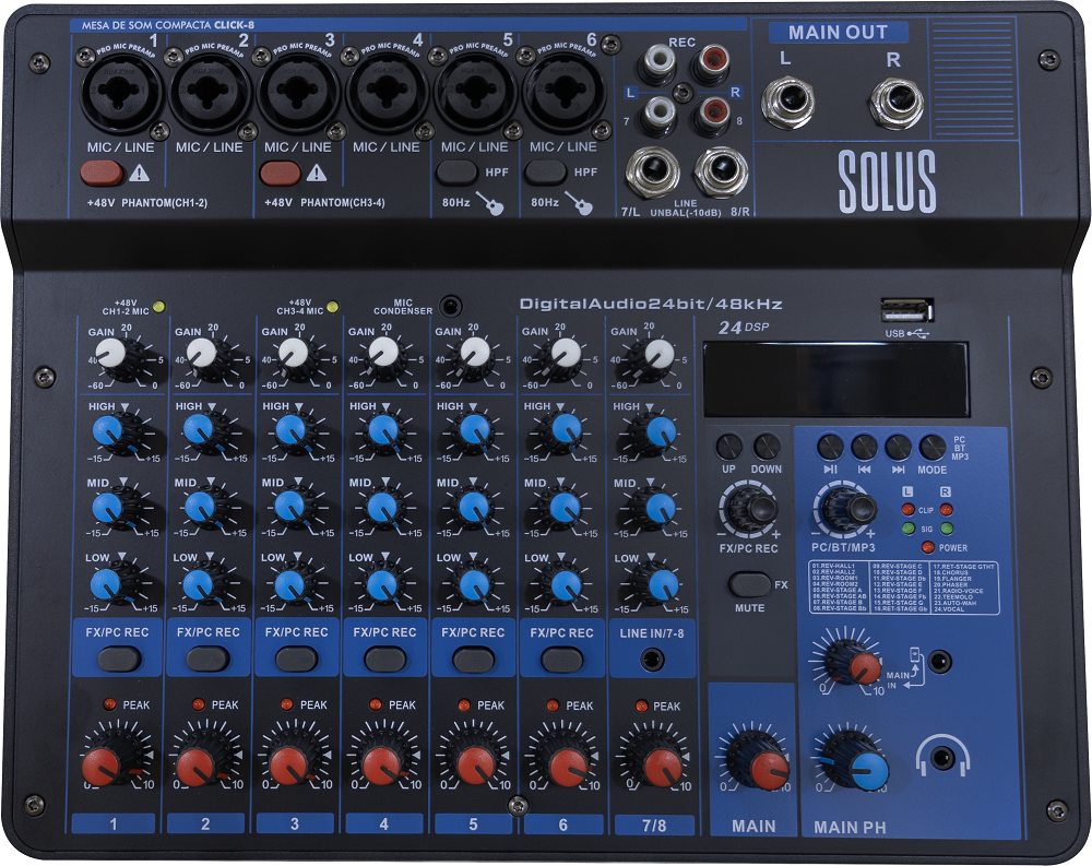 A Solus CLICK-8 é a mesa de som compacta ideal para quem precisa de mais canais e maior controle de áudio, mantendo praticidade e excelente custo-benefício. Indicada para igrejas, bandas, eventos, estúdios caseiros e sonorização de pequenos espaços.